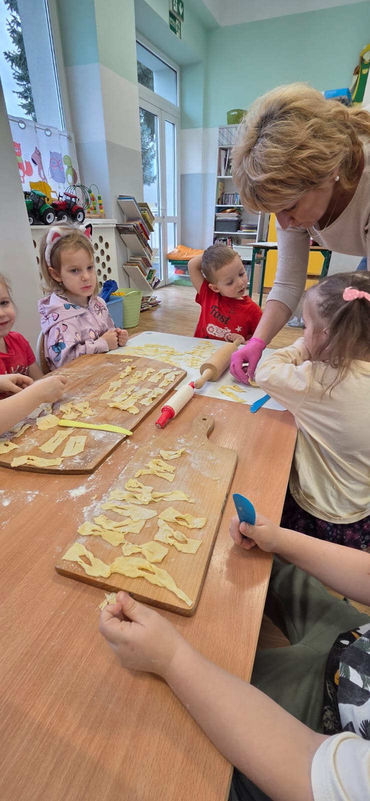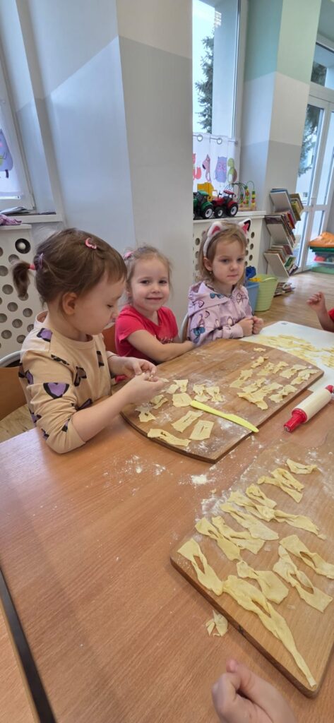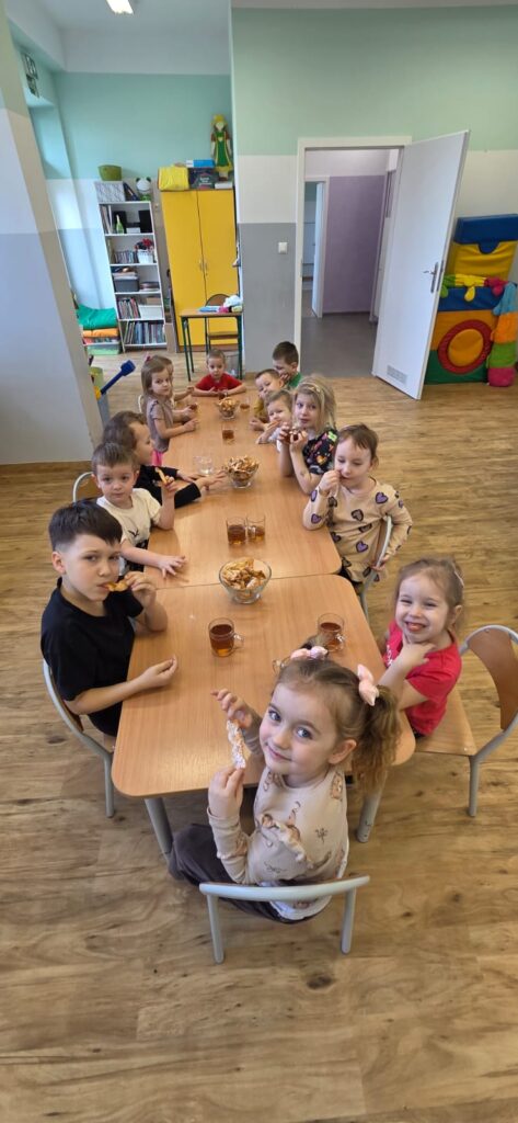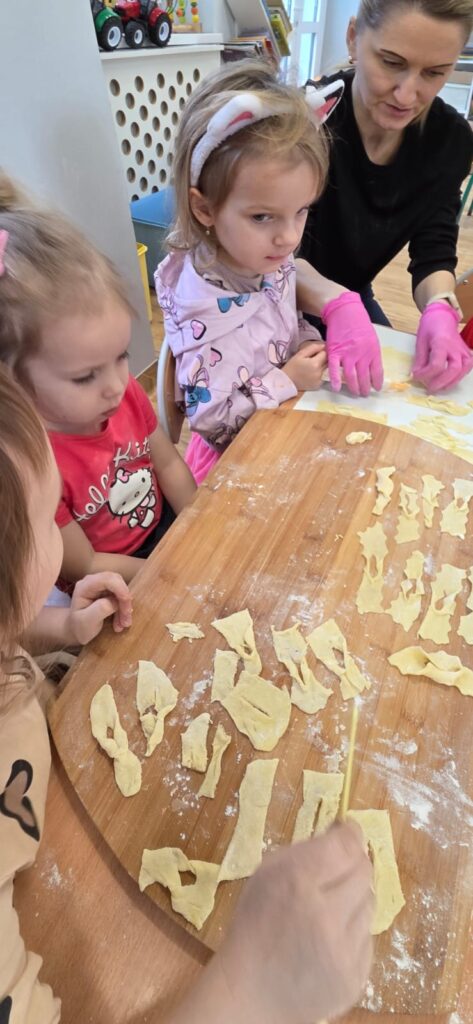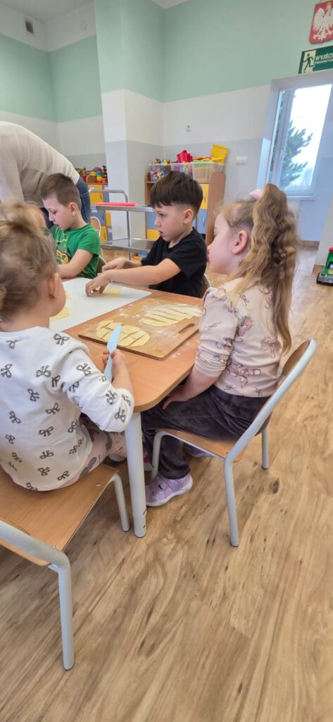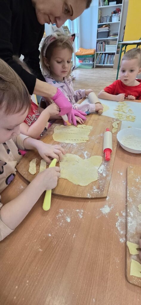 Są takie dni w przedszkolu, które pachną radością… i w piątek 13.02.2026 r. właśnie tak było! ✨ Choć kalendarzowy Tłusty Czwartek już za nami, w naszym przedszkolu w piątek świętowaliśmy jego słodką, pączkową odsłonę – w nieco spóźnionej, ale równie radosnej atmosferze! 🍩✨ W ramach tego wyjątkowego dnia nasze Przedszkolaki przygotowały własnoręcznie pyszne faworki. Od samego rana nasze Przedszkolaki wcieliły się w rolę małych mistrzów kuchni.👨‍🍳👩‍🍳 Samodzielnie przygotowywały faworki – wałkowały ciasto, wykrawały kształty i z ogromnym zaangażowaniem uczestniczyły w każdym etapie pracy. To nie tylko kulinarna przygoda, ale przede wszystkim rozwijanie samodzielności, cierpliwości i współpracy. Kiedy słodkości piekły się w przedszkolnej kuchni, kontynuowaliśmy dzień pełen wartościowych aktywności. Dzieci grały w memory, układały puzzle oraz rozmawiały o produktach spożywczych wykorzystanych do przygotowania faworków. Była to świetna okazja do poszerzenia wiedzy, rozwijania pamięci i logicznego myślenia, a także budowania zdrowych nawyków żywieniowych. Na zakończenie czekała na nas pyszna niespodzianka – świeże, chrupiące faworki i ciepła herbata. Smakowały wyjątkowo, bo przygotowane własnymi rękami. Talerze szybko opustoszały, a uśmiechy dzieci były najlepszym dowodem na to, jak wspaniały to był dzień. 💛
