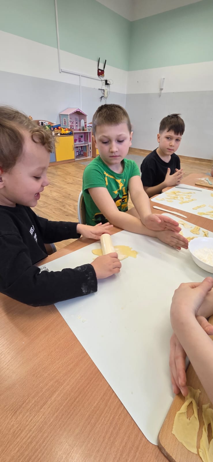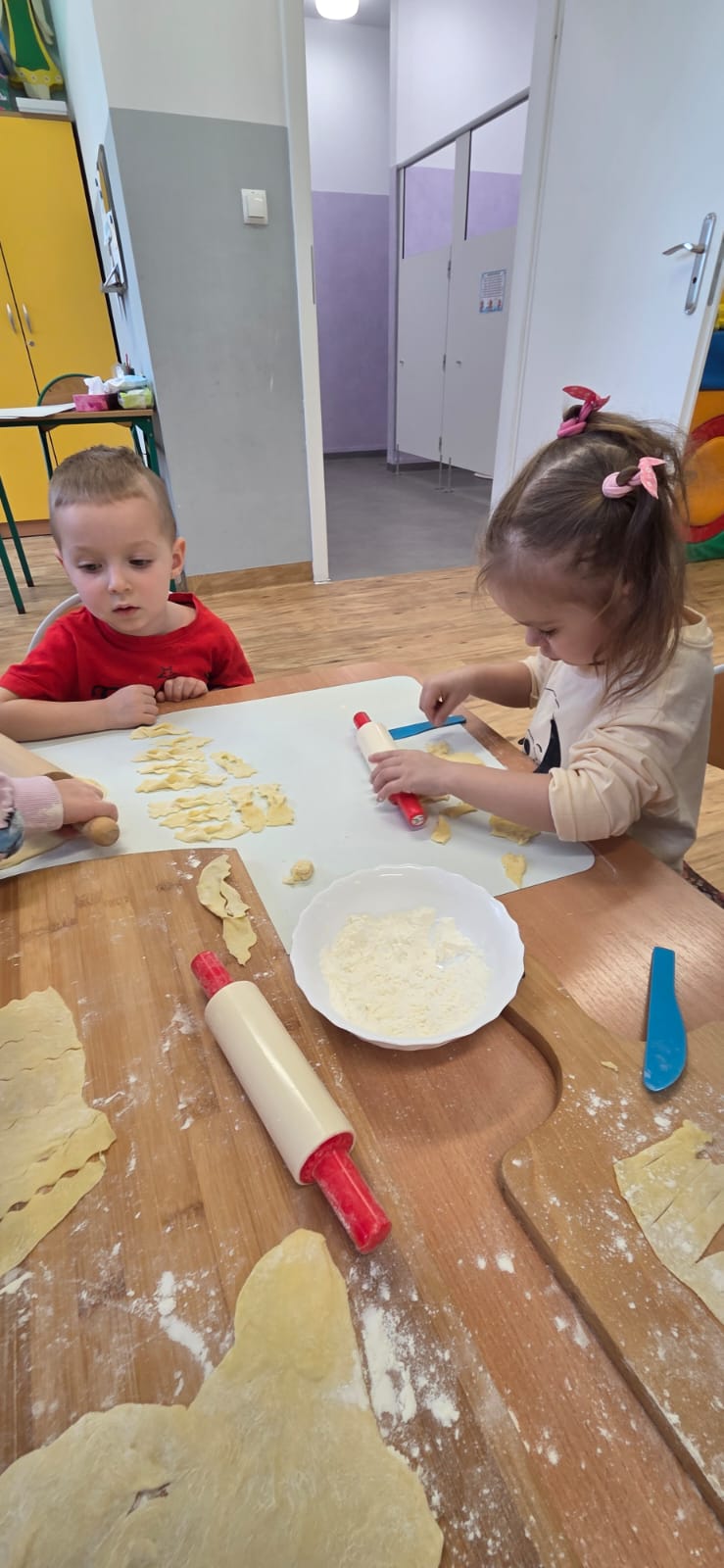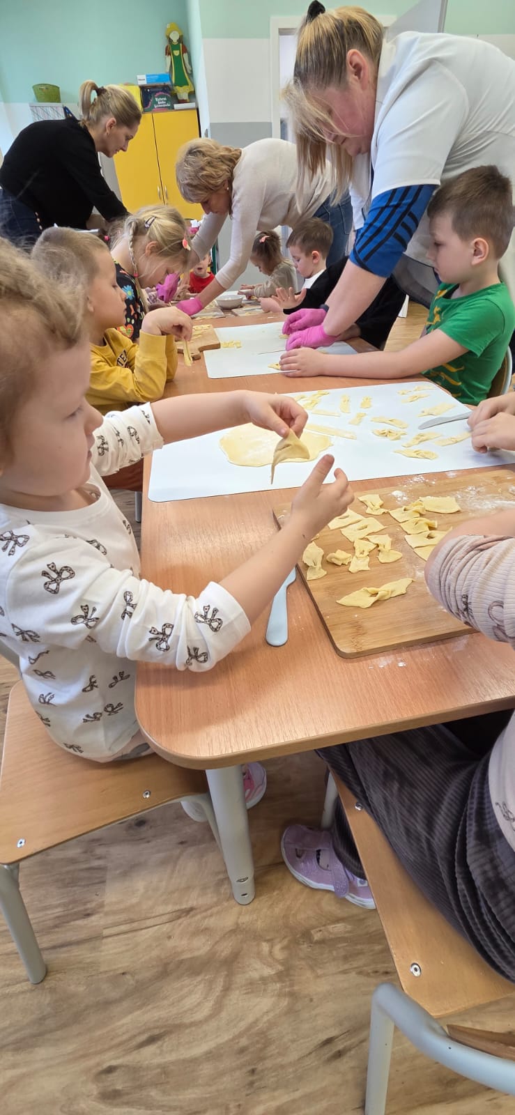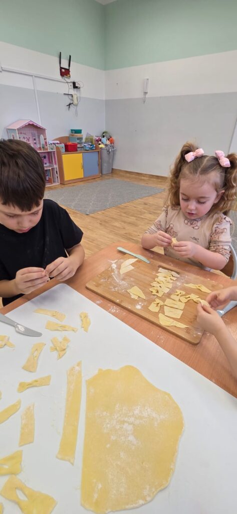 Są takie dni w przedszkolu, które pachną radością… i w piątek 13.02.2026 r. właśnie tak było! ✨ Choć kalendarzowy Tłusty Czwartek już za nami, w naszym przedszkolu w piątek świętowaliśmy jego słodką, pączkową odsłonę – w nieco spóźnionej, ale równie radosnej atmosferze! 🍩✨ W ramach tego wyjątkowego dnia nasze Przedszkolaki przygotowały własnoręcznie pyszne faworki. Od samego rana nasze Przedszkolaki wcieliły się w rolę małych mistrzów kuchni.👨‍🍳👩‍🍳 Samodzielnie przygotowywały faworki – wałkowały ciasto, wykrawały kształty i z ogromnym zaangażowaniem uczestniczyły w każdym etapie pracy. To nie tylko kulinarna przygoda, ale przede wszystkim rozwijanie samodzielności, cierpliwości i współpracy. Kiedy słodkości piekły się w przedszkolnej kuchni, kontynuowaliśmy dzień pełen wartościowych aktywności. Dzieci grały w memory, układały puzzle oraz rozmawiały o produktach spożywczych wykorzystanych do przygotowania faworków. Była to świetna okazja do poszerzenia wiedzy, rozwijania pamięci i logicznego myślenia, a także budowania zdrowych nawyków żywieniowych. Na zakończenie czekała na nas pyszna niespodzianka – świeże, chrupiące faworki i ciepła herbata. Smakowały wyjątkowo, bo przygotowane własnymi rękami. Talerze szybko opustoszały, a uśmiechy dzieci były najlepszym dowodem na to, jak wspaniały to był dzień. 💛